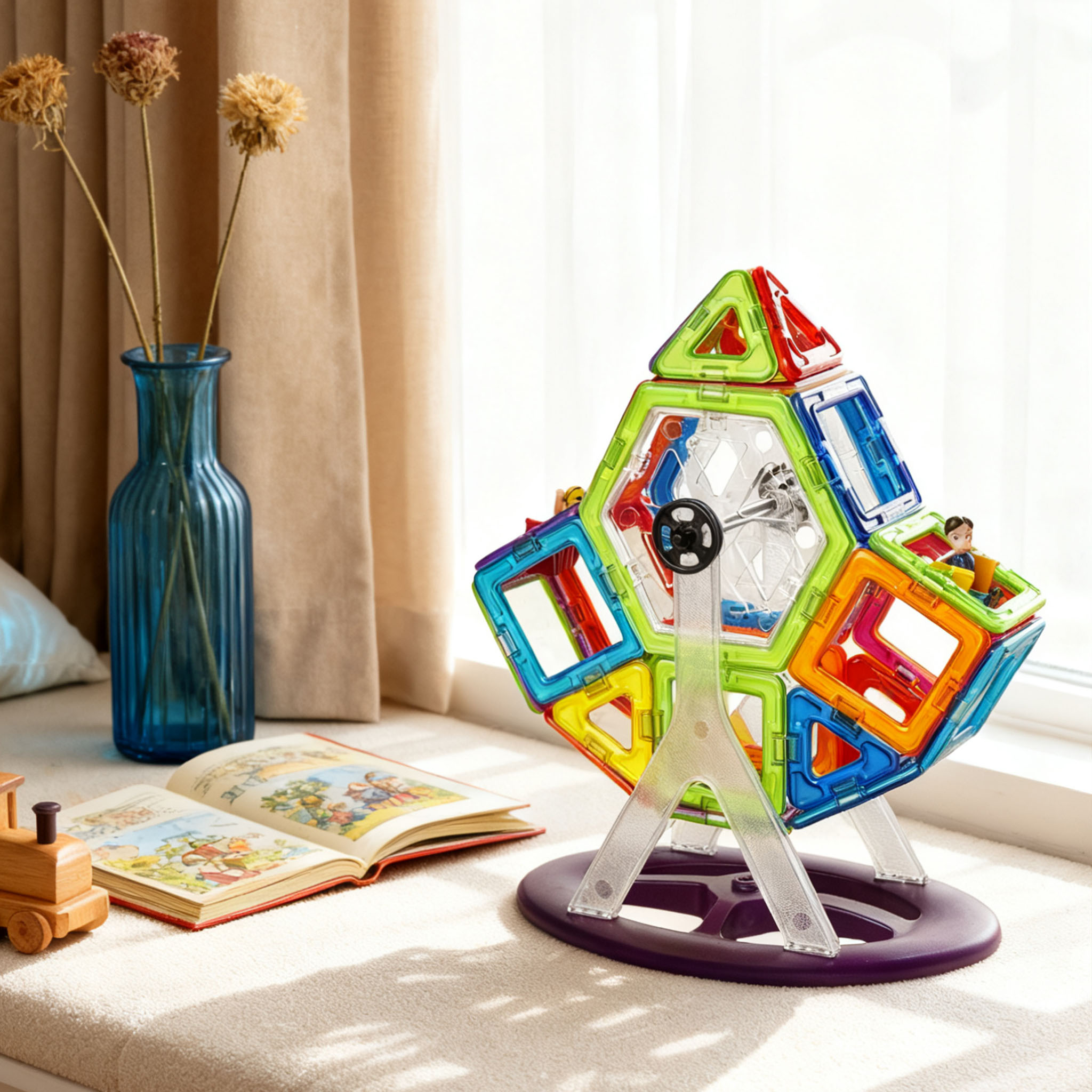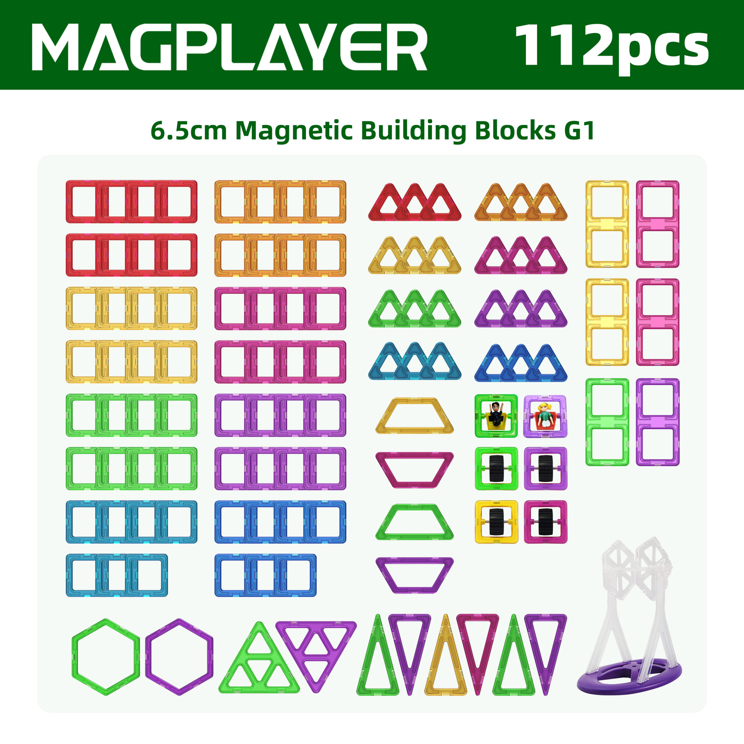 Discover endless creative possibilities with the Magplayer 112-Piece Classic Tiles Pack!This complete set includes various shapes of magnetic tiles, including figurine magnetic tiles, as well as squares and various triangles, and is equipped with a unique pulling play method – paired with a Ferris wheel accessory. This set is a perfect extension of any magnetic puzzle collection, bringing STEAM learning into life through an engaging hands-on game
