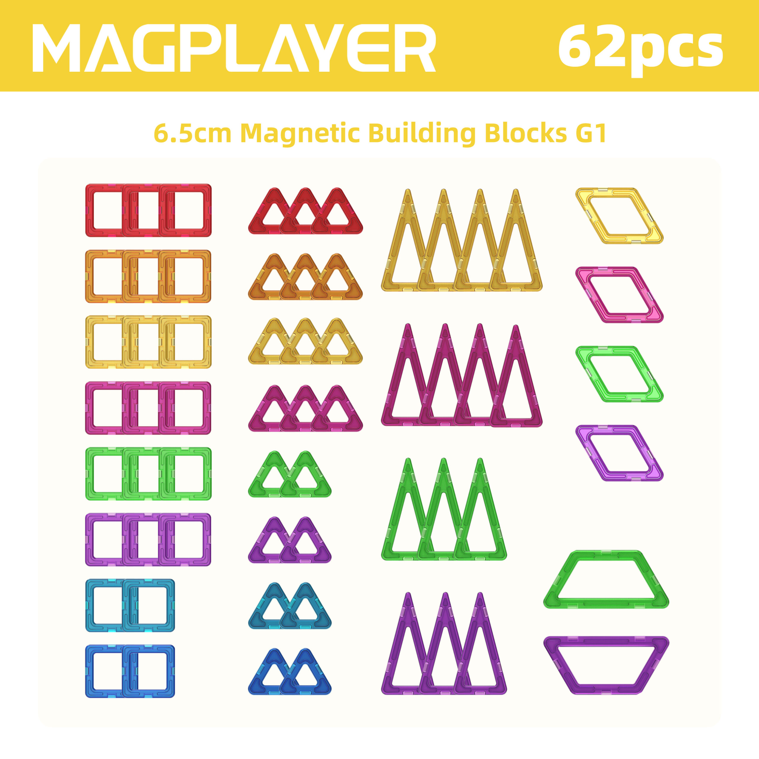 Discover endless creative possibilities with the Magplayer 62-piece classic tile set! This complete set includes tiles in various shapes, squares, and various triangles, and is equipped with a unique pull-out play feature. This set is the perfect extension of any magnetic puzzle collection, bringing STEAM learning into life through an engaging hands-on game.