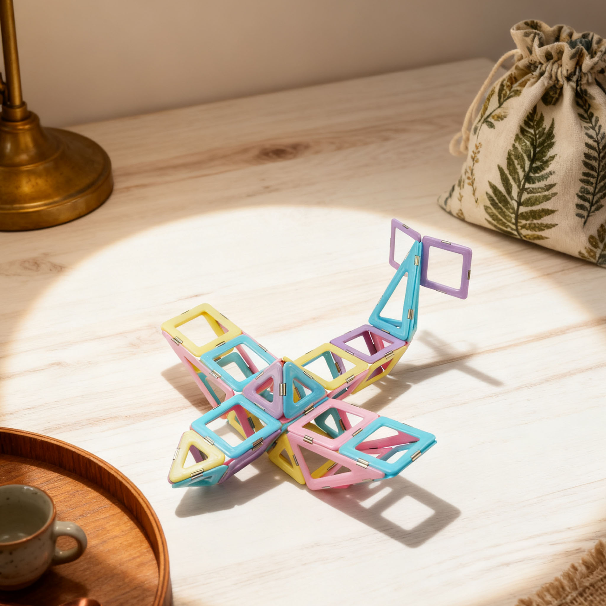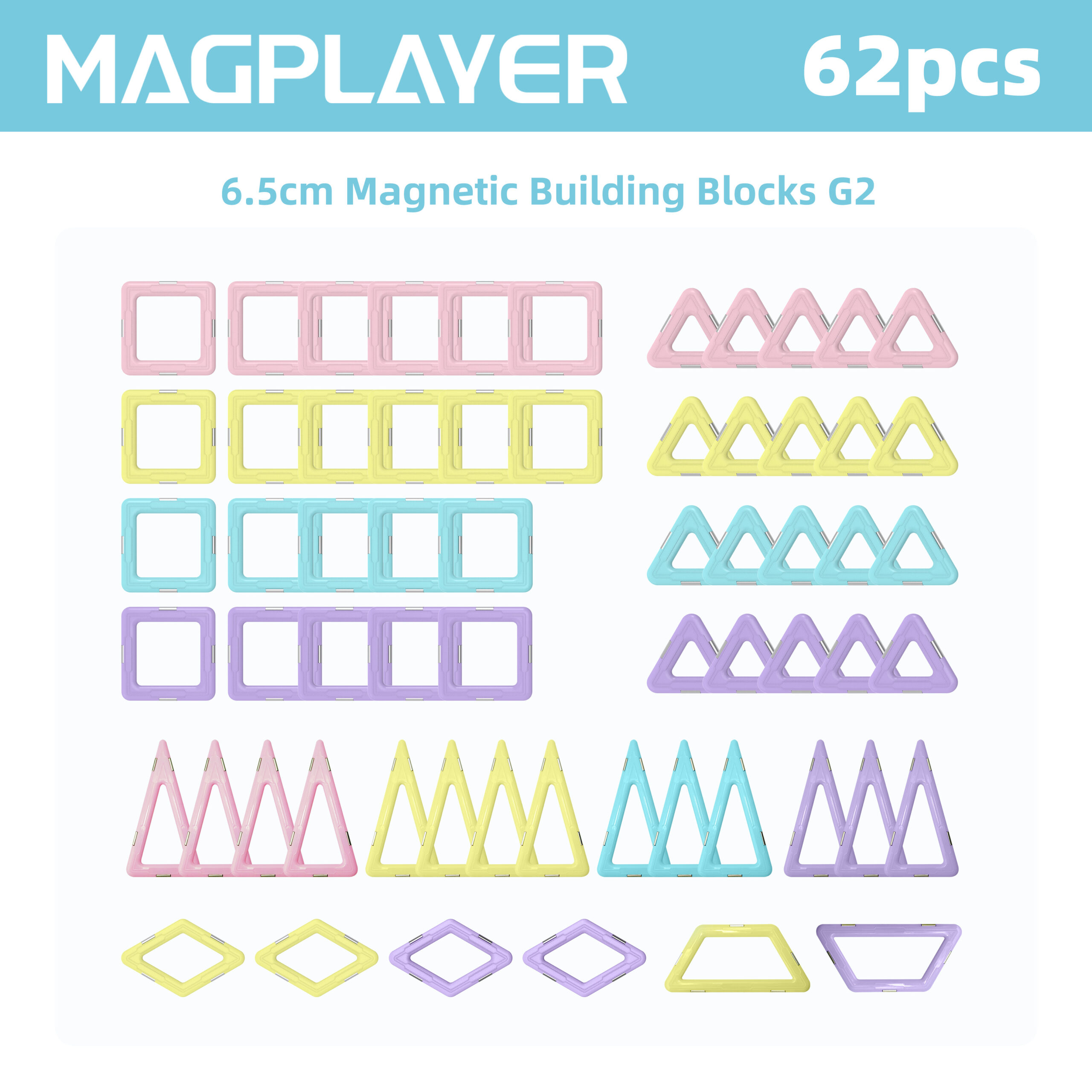 Discover endless creative possibilities with the Magplayer 62-piece Macaron Tiles set! This complete set includes tiles in various shapes, squares, and various triangles, and is equipped with a unique pull-out play feature. This set is the perfect extension of any magnetic puzzle collection, bringing STEAM learning into life through an engaging hands-on game.