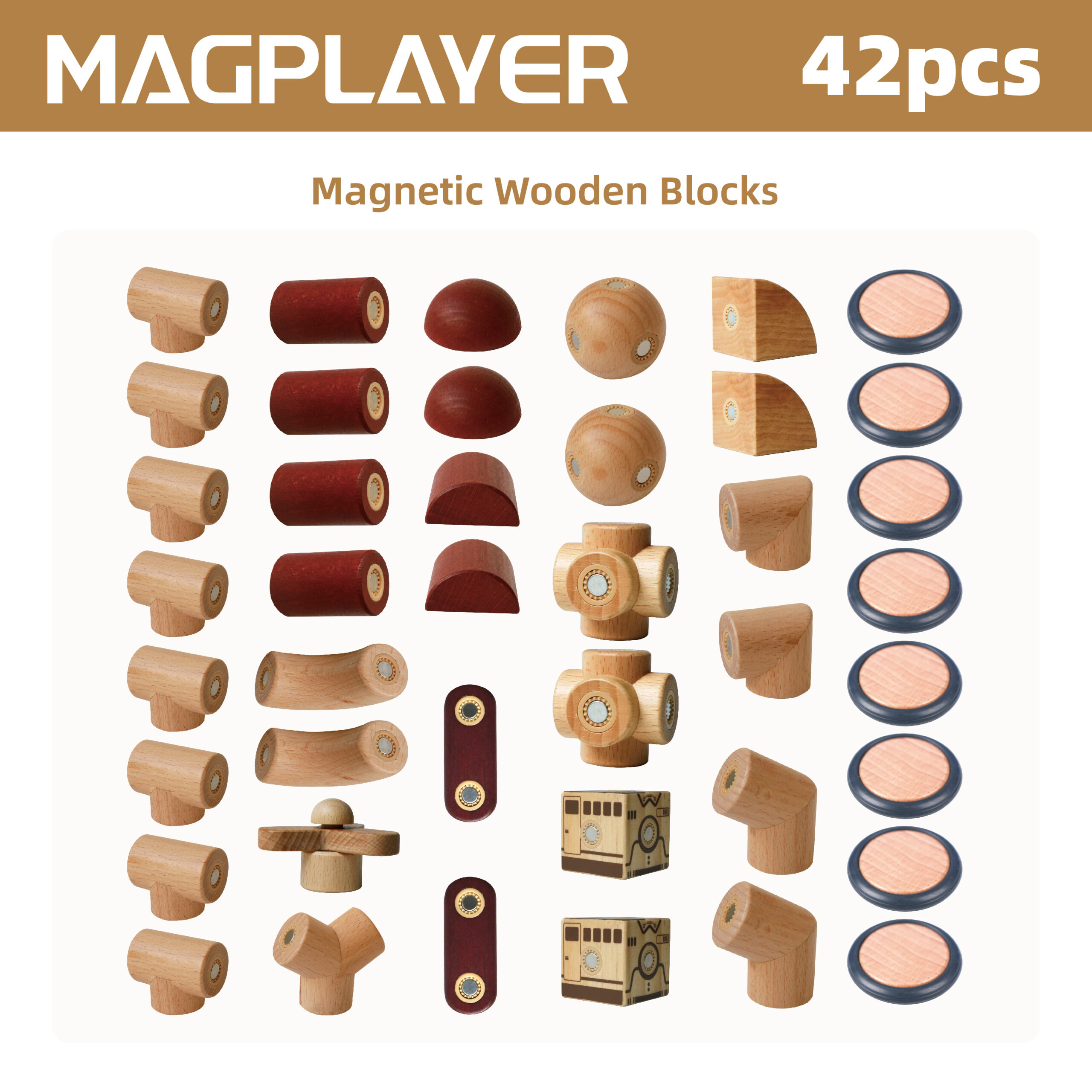 Discover endless creative possibilities with the Magplayer 42-PieceWooden Blocks Pack!This complete set includes connecting pieces of various shapes, including wooden strips, as well as Y-shaped and T-shaped pieces, and features unique magnetic joints—including a distinctive gear-like sound when twisted. This set is the ideal extension of any magnetic puzzle collection, bringing STEAM learning to life through engaging hands-on play.