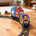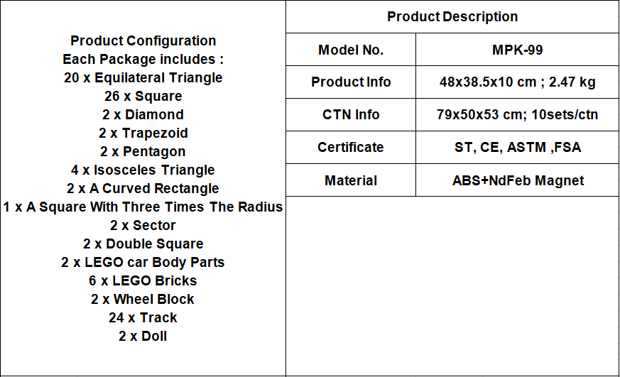 Use the Magplayer 99 piece classic tile set to explore endless creative possibilities! This complete set includes tiles of various shapes, including carboard accessories, squares, and various triangles, and is equipped with a wheel track. This set is a perfect extension of any magnetic puzzle collection, bringing STEAM learning into life through an engaging hands-on game.
