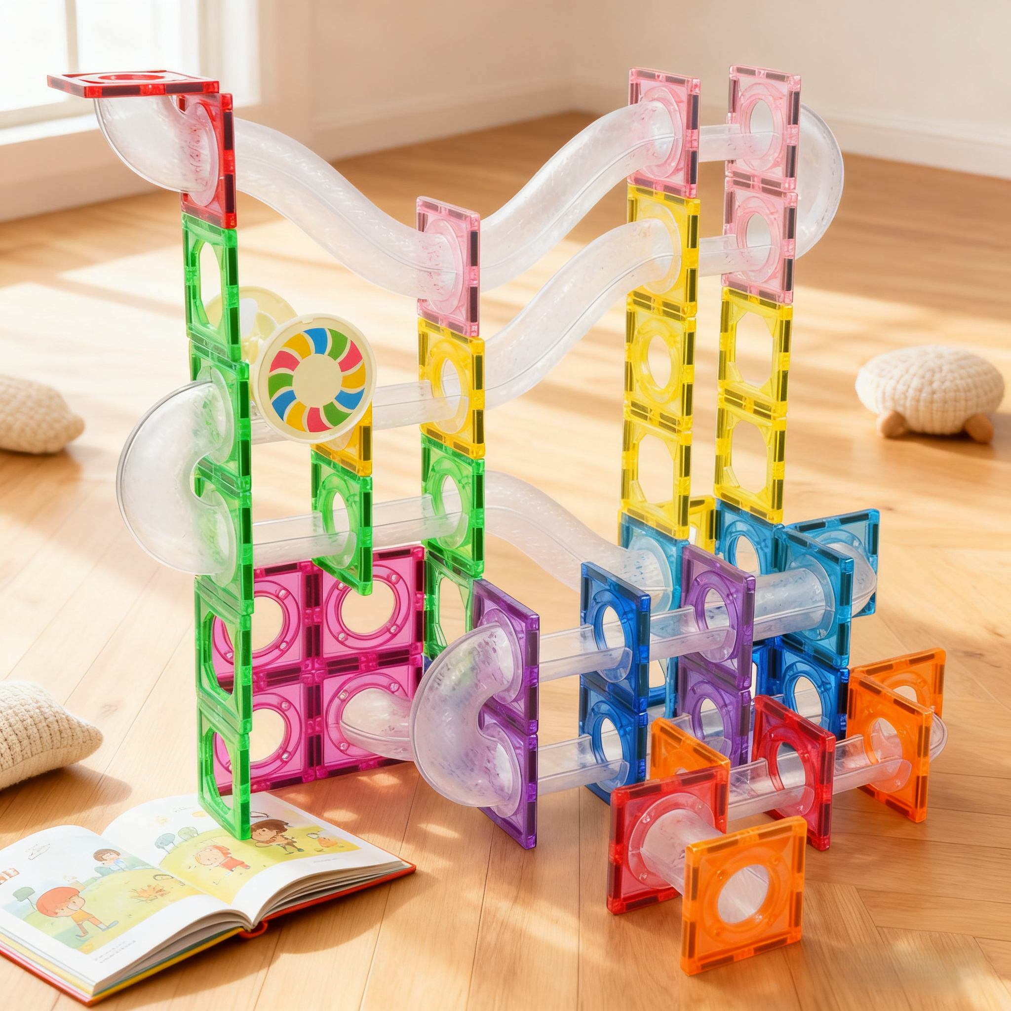 Discover endless creative possibilities with the Magplayer 276-Piece Pastel Ball Run Pack! This complete set features soft pastel magnetic tiles, including glowing light-up balls, and sleek glass marbles, combined with exclusive clear fluted tubes—including stair soundscape tubes, S-bend tubes, and split tubes for thrilling multi-path races. An ideal expansion to any magnetic tile collection, this pack brings STEAM learning to life through engaging, hands-on play.