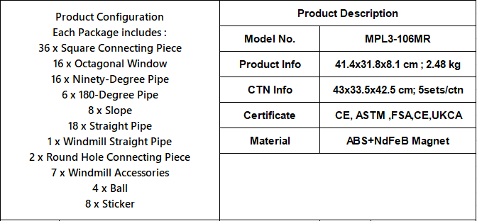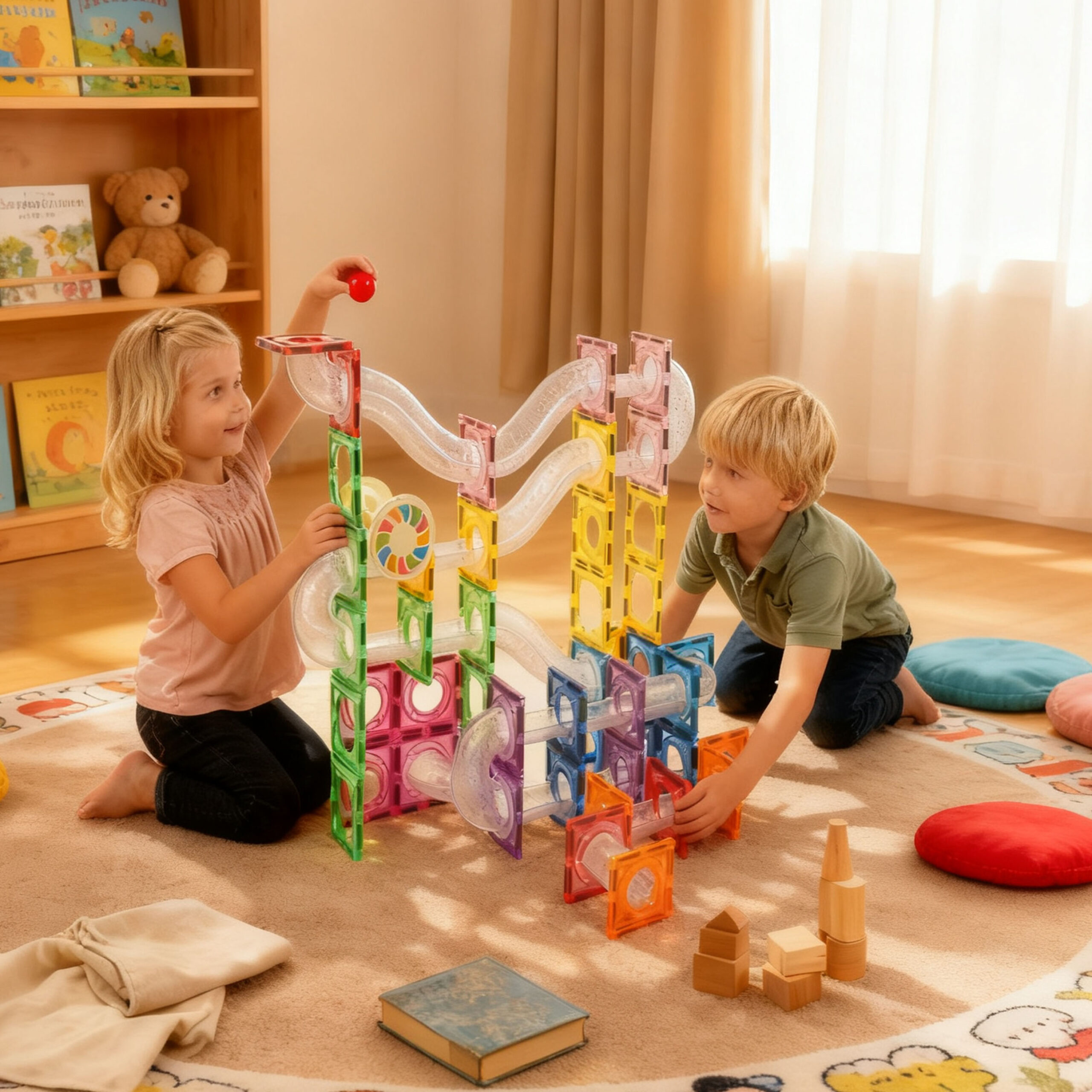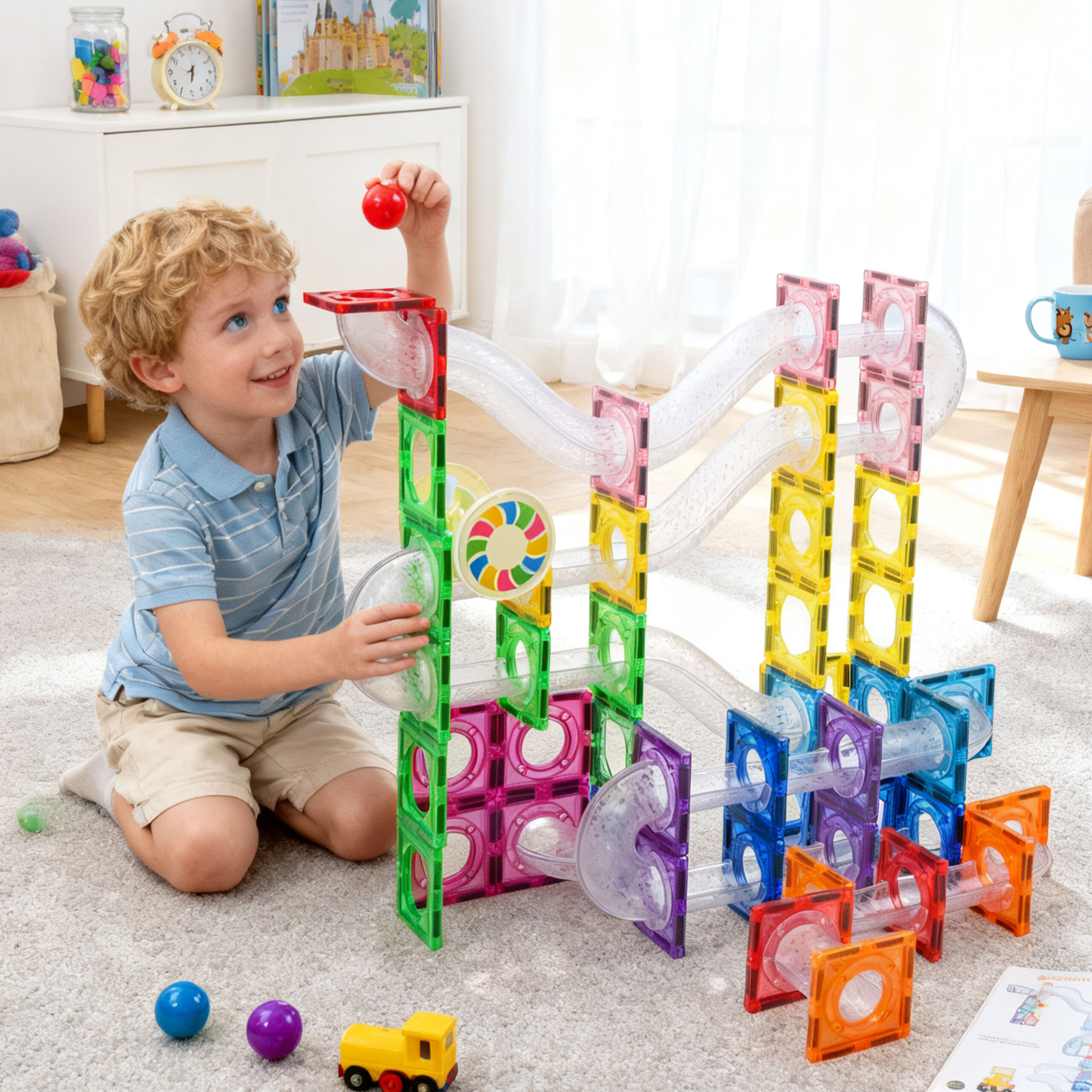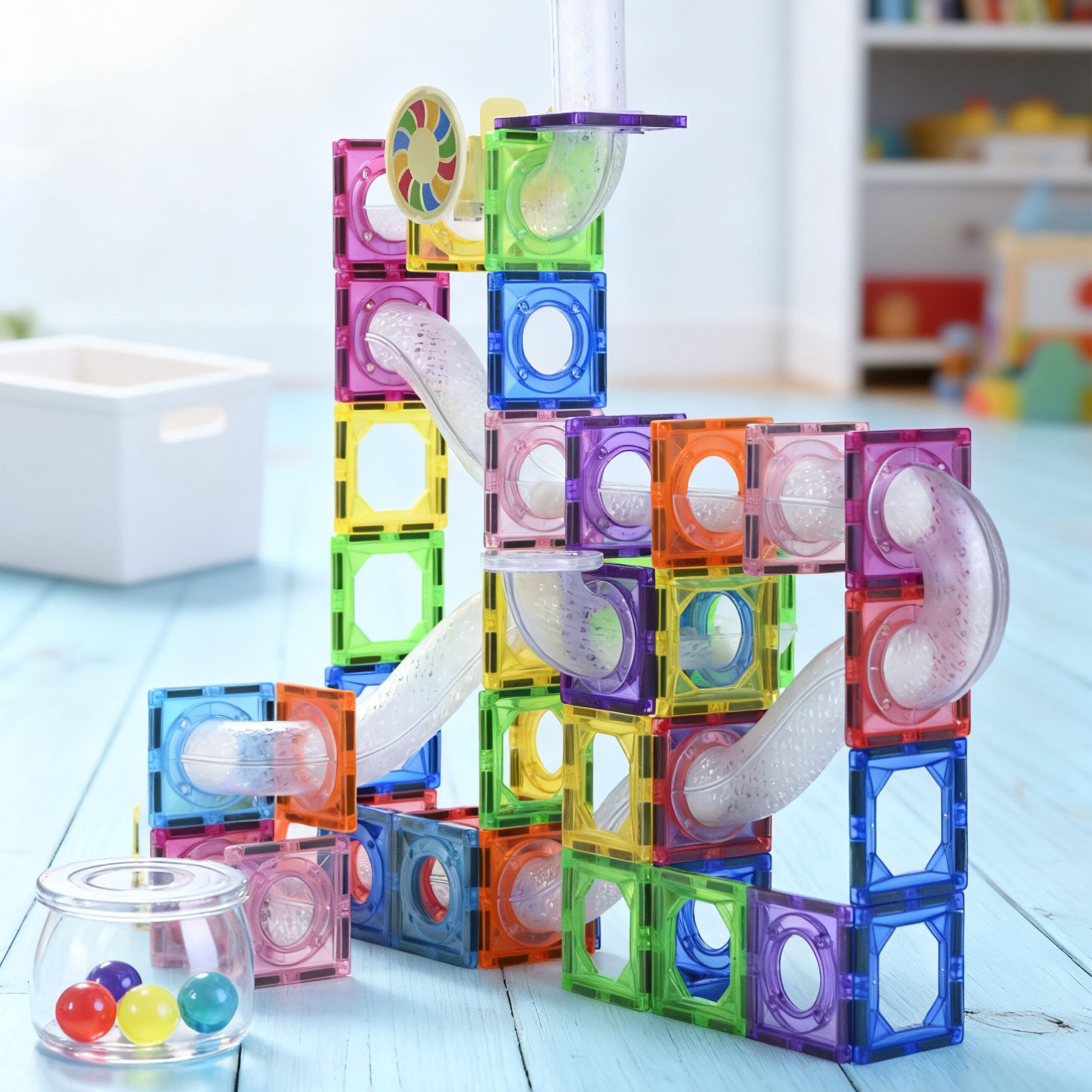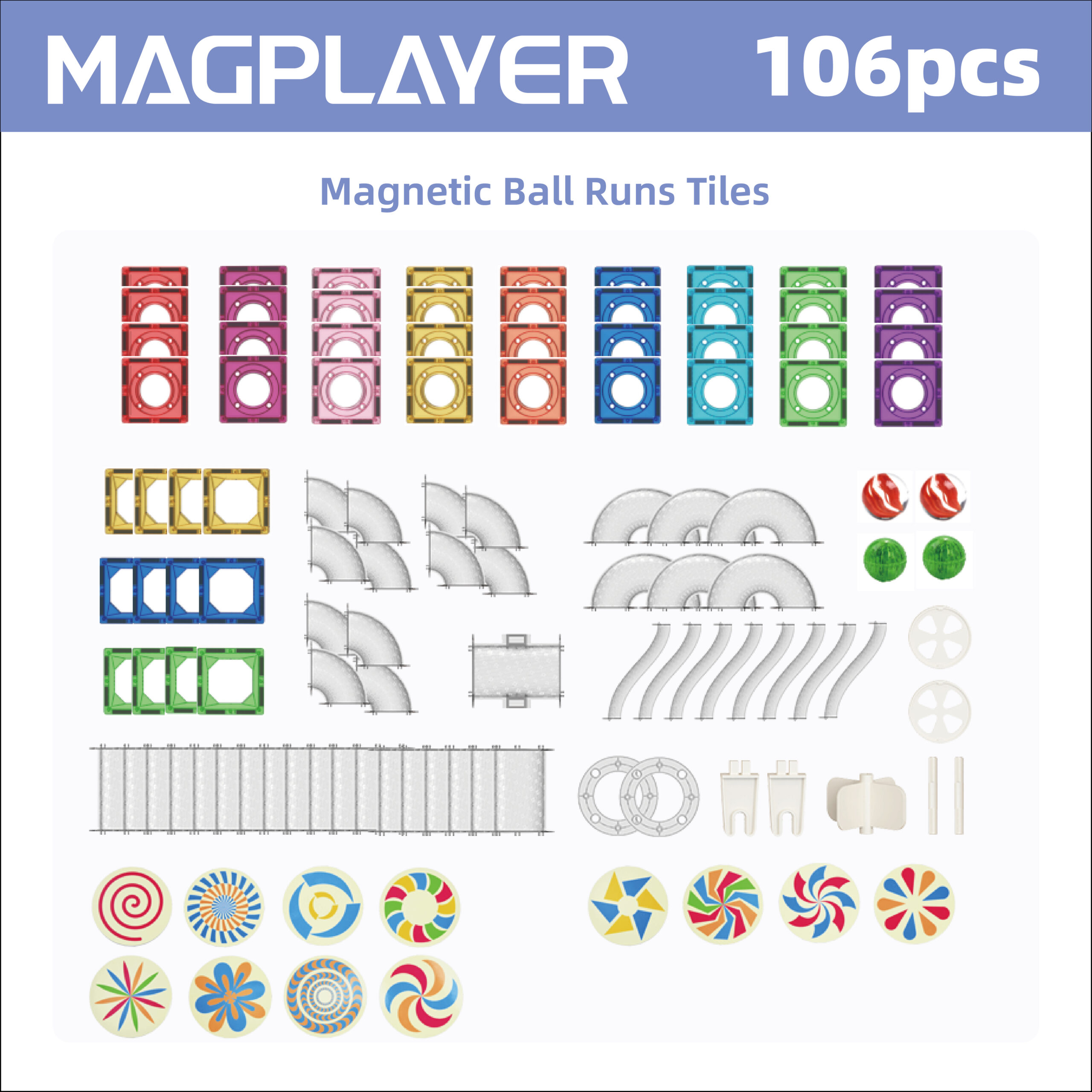 Discover endless creative possibilities with the Magplayer 106-Piece Pastel Ball Run Pack! This complete set features soft pastel magnetic tiles, including glowing light-up balls, and sleek glass marbles, combined with exclusive clear fluted tubes—including stair soundscape tubes, S-bend tubes, and split tubes for thrilling multi-path races. An ideal expansion to any magnetic tile collection, this pack brings STEAM learning to life through engaging, hands-on play.