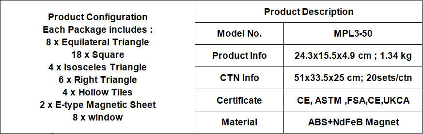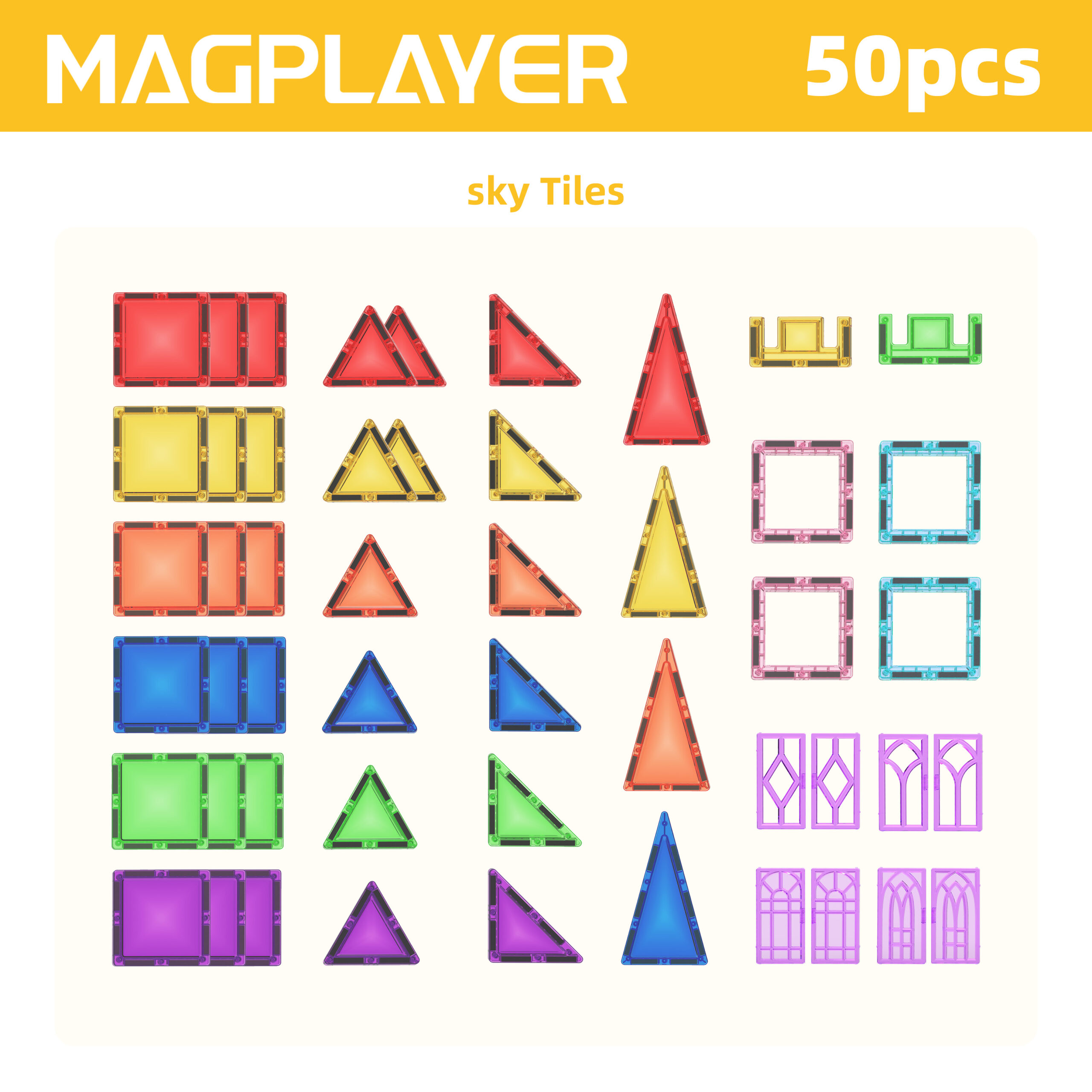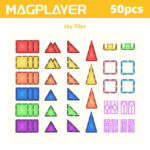 Explore endless creative possibilities with the Magplayer 50-piece SKY Tiles magnetic tile set! This complete set includes magnetic tiles in various shapes, including window accessories, as well as half-round and half-cut blocks, with unique magnetic joints – building even tighter and safer. This set is the perfect addition to any magnetic puzzle collection, bringing STEAM learning to life through engaging hands-on games.